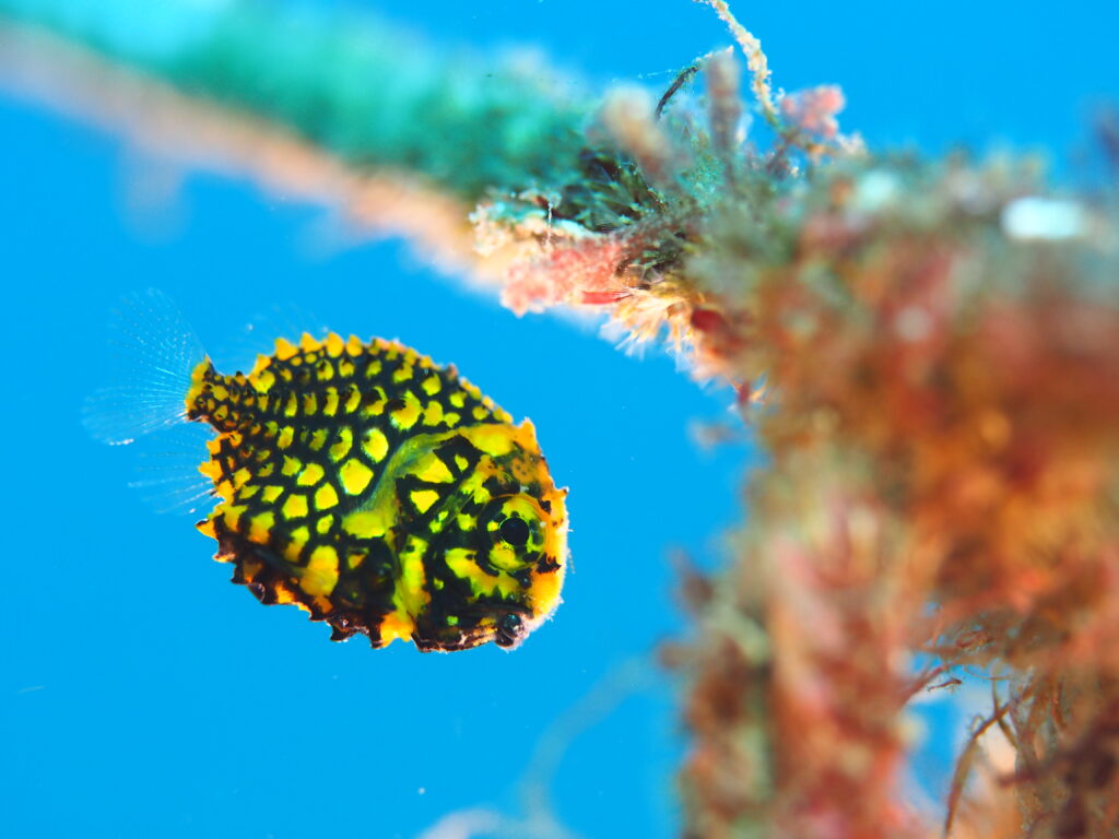 と言いながら本日のこちらの写真は私が内浦ビーチでミラーレス一眼を使用して撮影した、見せびらかしたいちびマツカサウオ👍かわいいでしょ〜💕