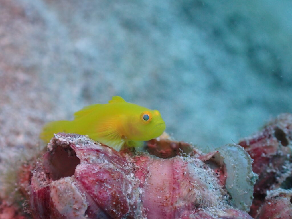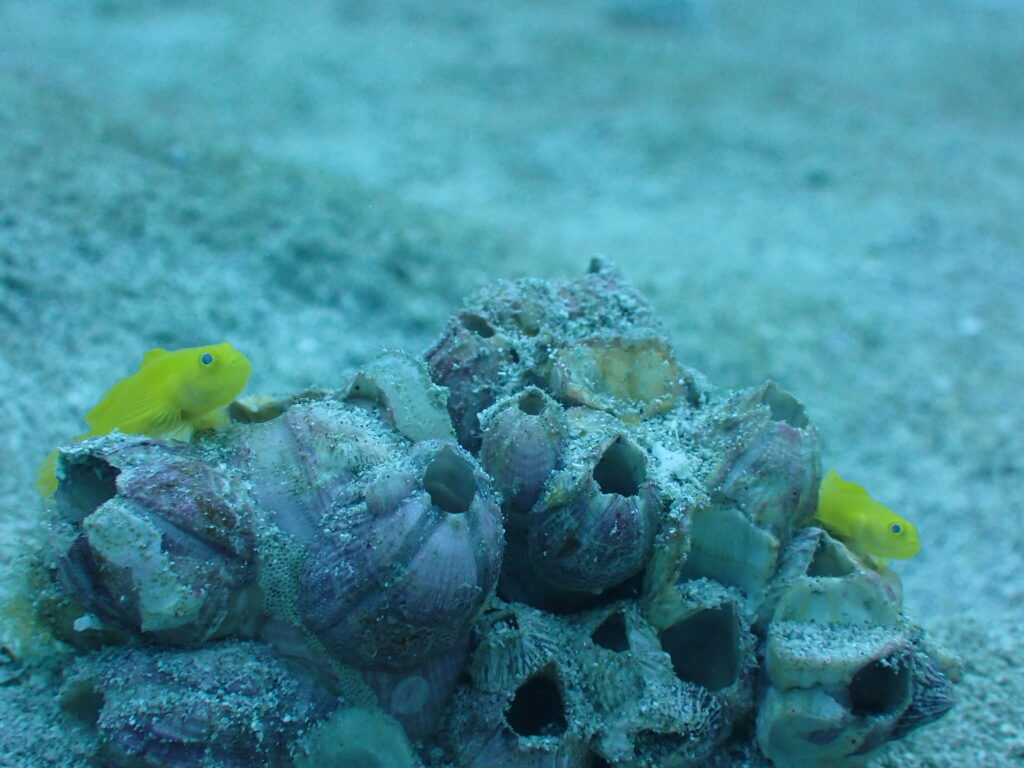 砂地では、フジツボを住処にしたミジンベニハゼが結構たくさん見られます。びこぴこ出てきて元気です!