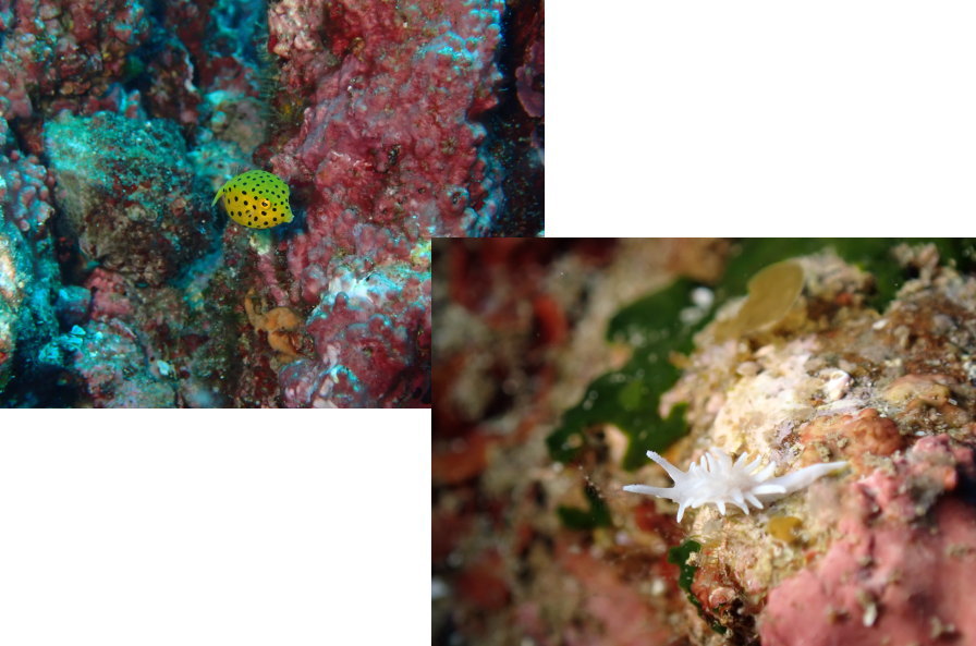 ミナミハコフグyg、シロイバラウミウシ