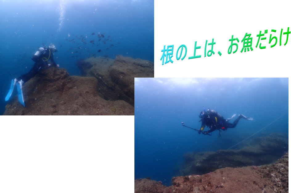 根の上はスズメダイやキンギョハナダイの群れがいっぱい!