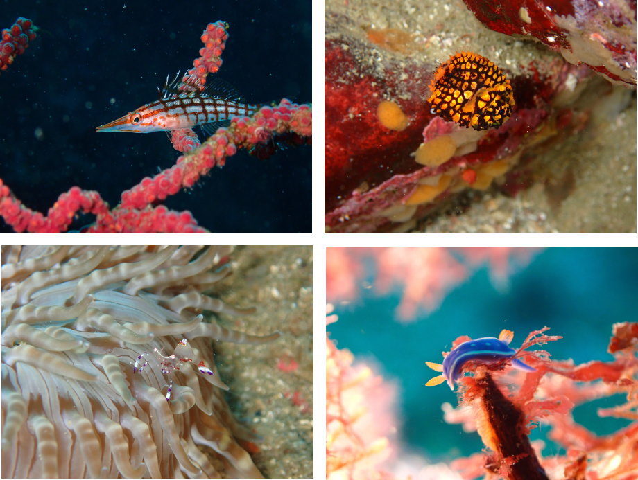 アカホシカクレエビ、アオウミウシ